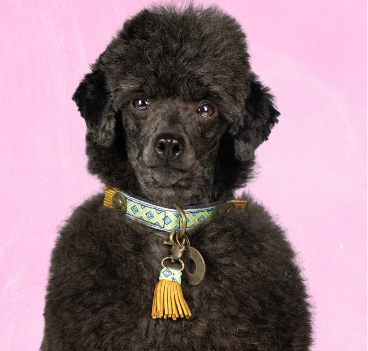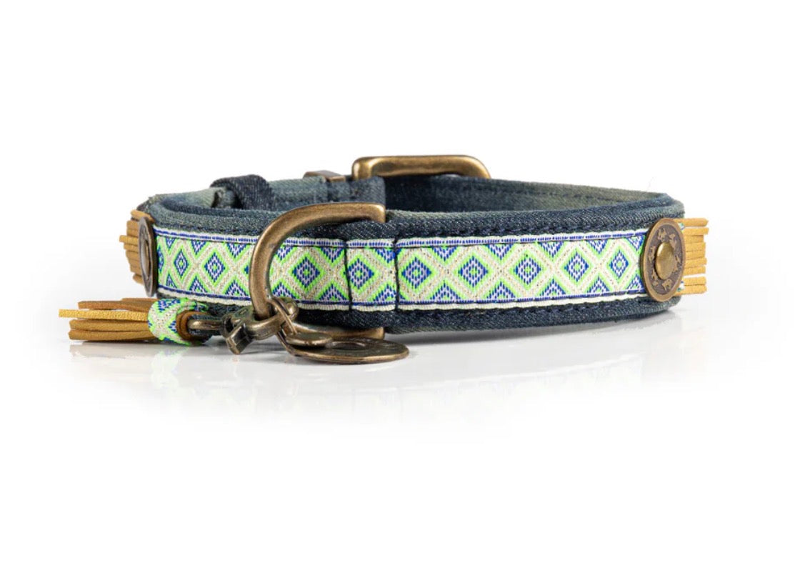 Das Judy ist ein Halsband aus Denim statt Leder. Ein echter Eyecatcher mit gelben und grünen Details. Stilvoll und bequem, dafür steht die Denim Kollektion.