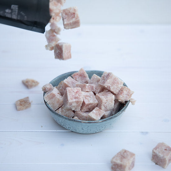 Unsere Fleischwürfel werden bei -19 Grad tiefgefroren und luftdicht in speziellen Verpackungen abgefüllt, um sie optimal für dich bereitzustellen. Diese Würfel sind ideal für kleinere Hunde geeignet.