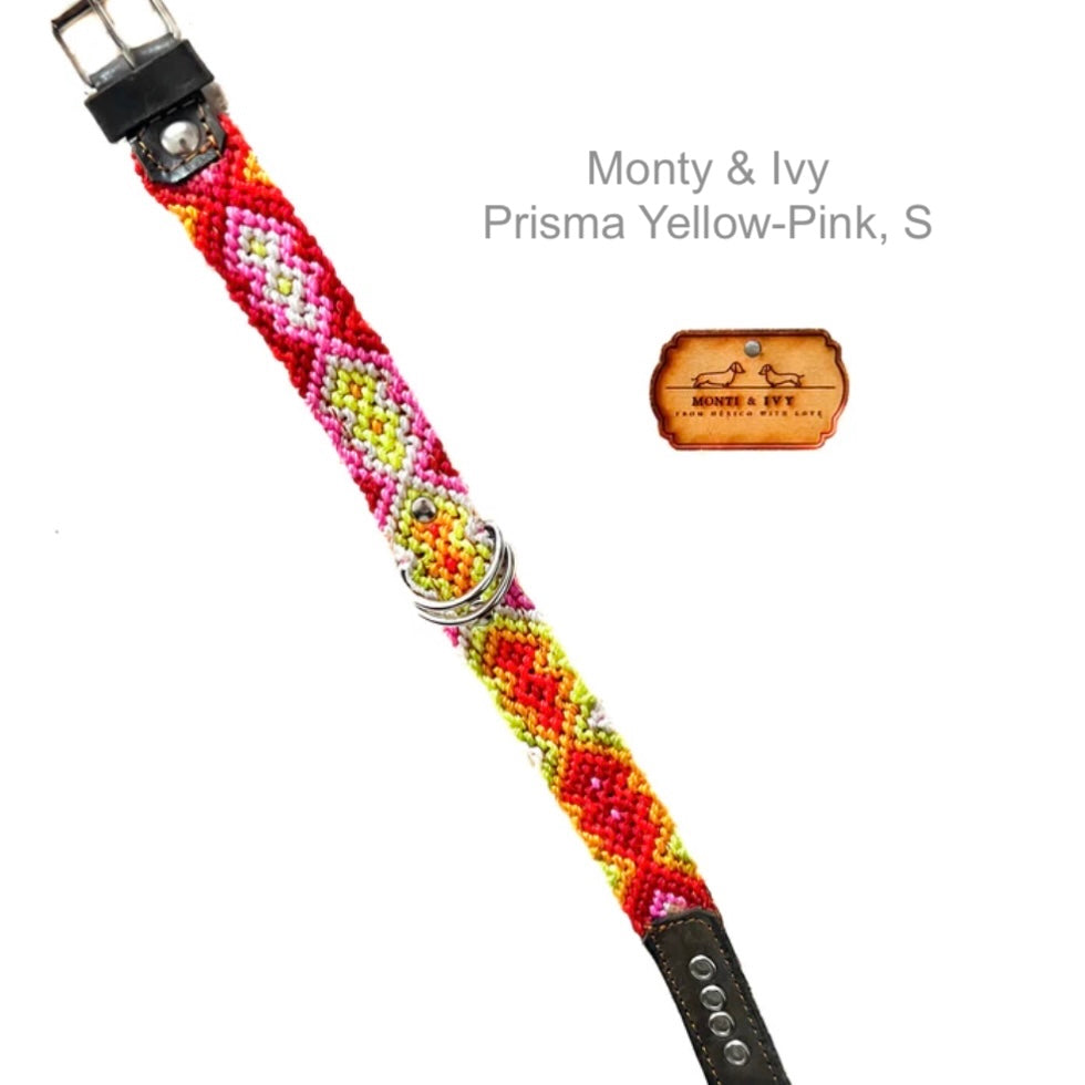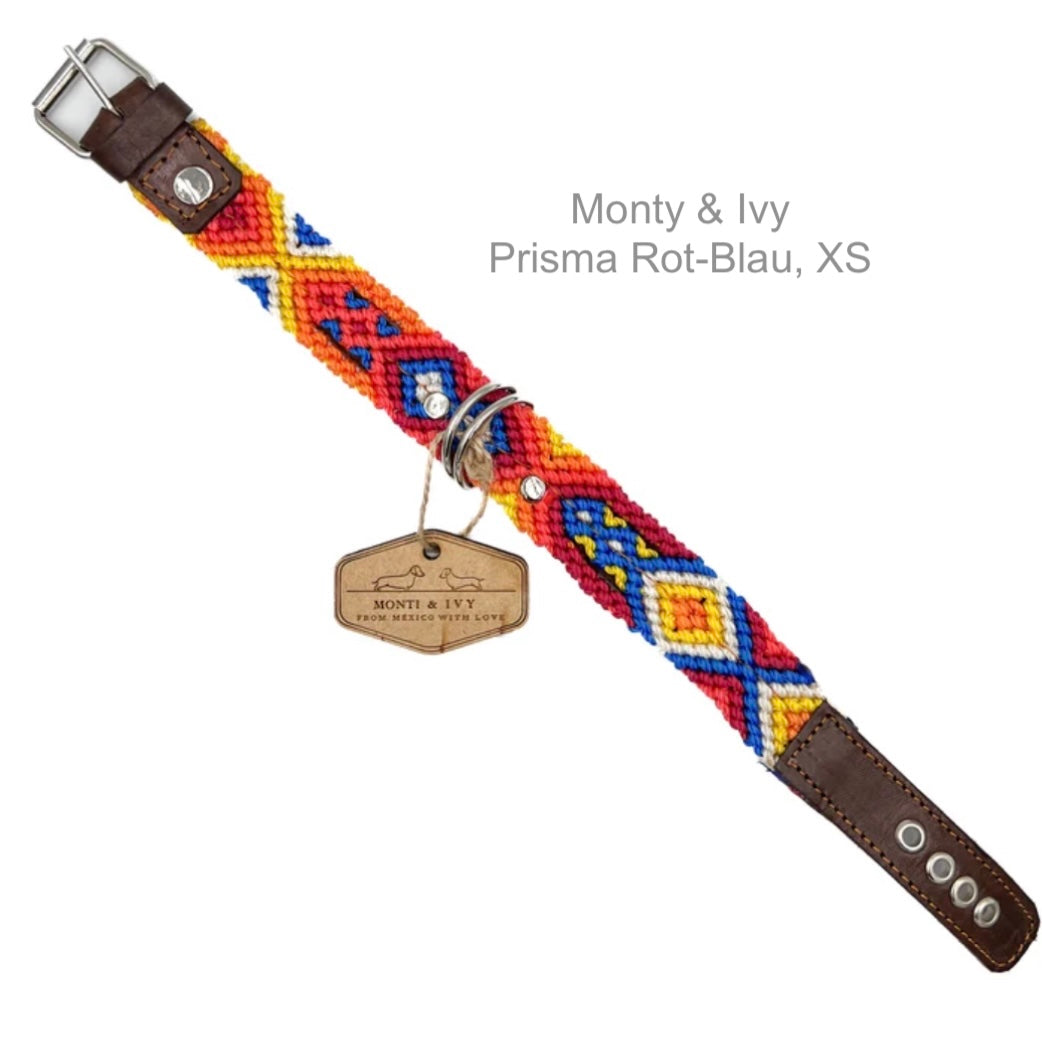 Dieses Halsband ist die perfekte Kombination zwischen unserer Halsband-Oase und unserem Paradies. Sie werden schöne gewebte Farbmuster finden, die mit Leder verstärkt sind. Das Leder am Boden und an der Vorderseite sorgt für Struktur und Festigkeit. Das volle Wellenmuster wird von erstaunlichen mexikanischen Handwerkern hergestellt. Jedes einzelne Design existiert nur einmal, ein zweites Mal findet man es nicht.