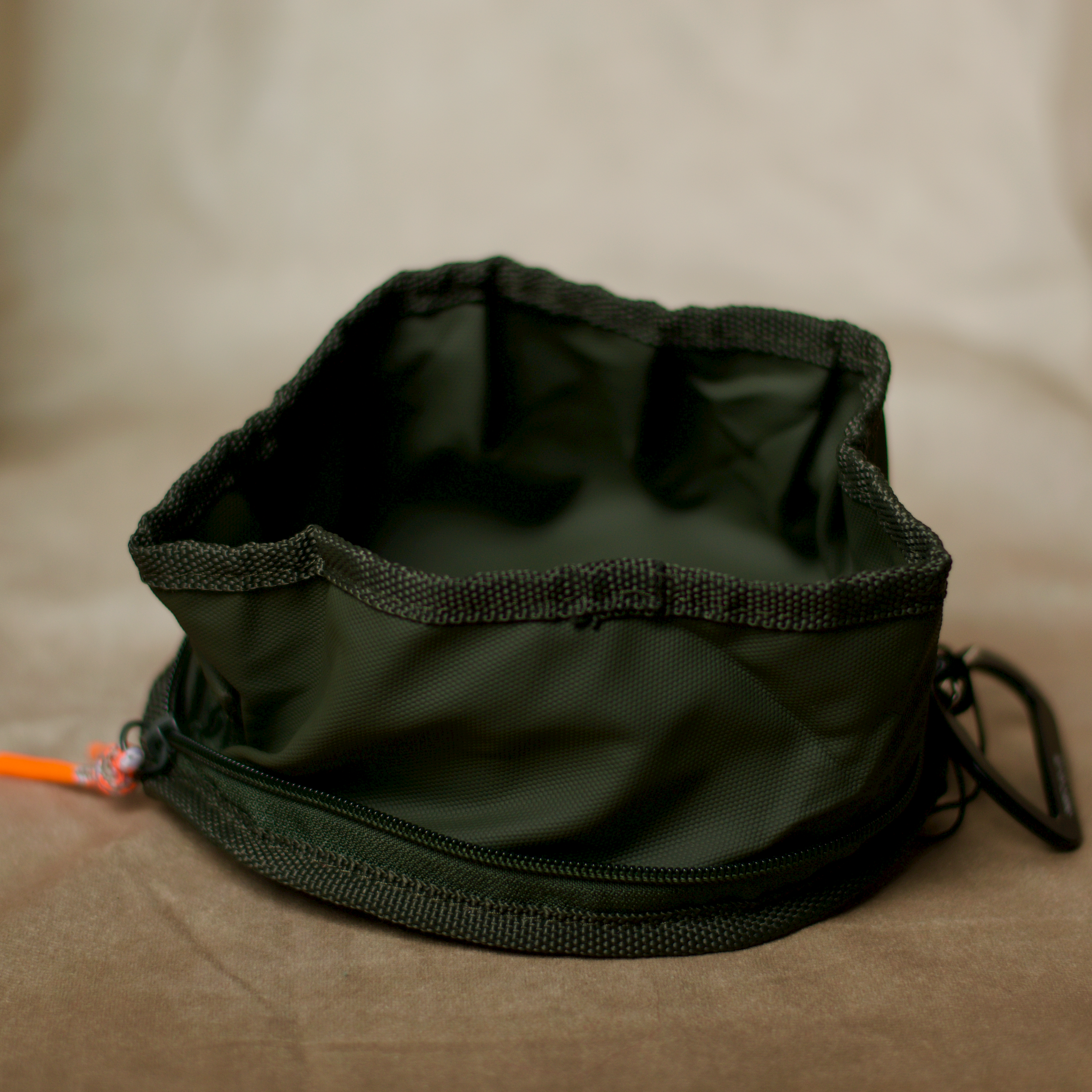 Einfach auffalten, mit Wasser oder Futter befüllen und nach dem Gebrauch wieder per Reißverschluss sicher verschließen – so bleibt alles sauber, ohne dass Flüssigkeit oder Futter in der Tasche auslaufen können. Über den leichten Karabiner lässt sich „Tura“ bequem an Rucksack, Tasche oder Leine befestigen.