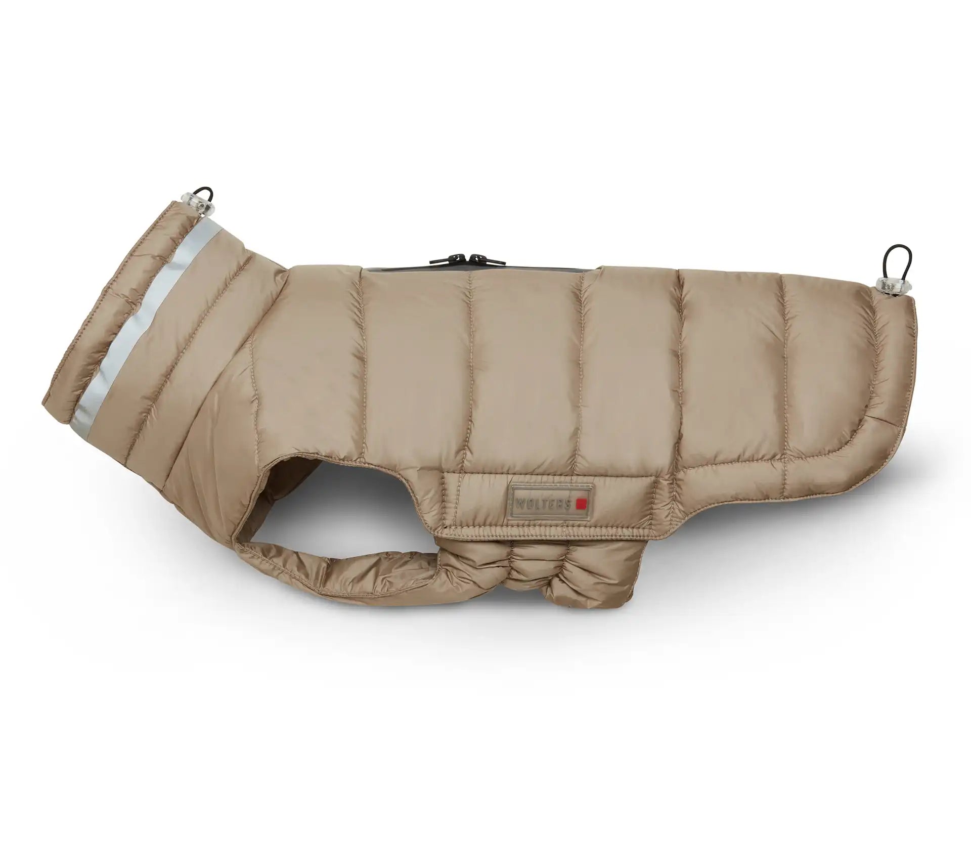 Der extra breite Kragen schützt den empfindlichen Halsbereich deines Hundes und sorgt gemeinsam mit dem reflektierenden Streifen für bessere Sichtbarkeit bei Dämmerung und Dunkelheit. Dank Zugösen am Kragen und Rückenabschluss lässt sich die Jacke optimal an Halsumfang und Körperform anpassen. Ein weiches Stretchgummi am Bauch erhöht den Tragekomfort zusätzlich.